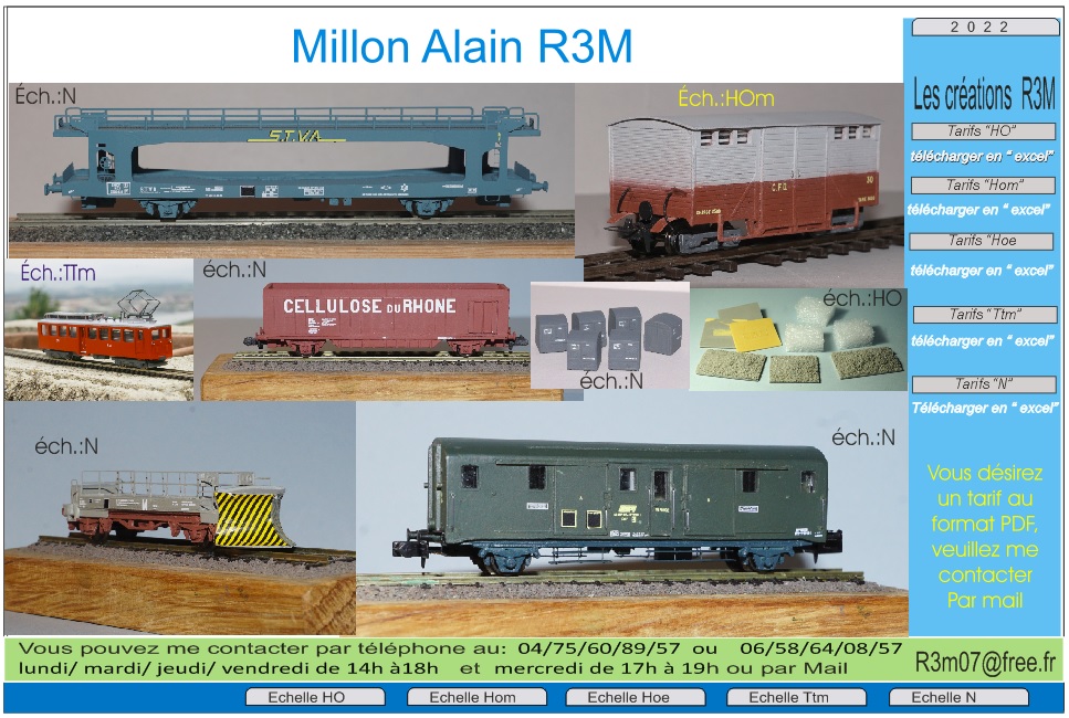 Voici toutes les informations sur le Magasin de modélisme ferroviaire Millon Alain R3M qui ce trouve au 440 All. Bellevue, 07130 Soyons (07). Sur cette fiche vous trouverez les photos, l'adresse, les horaires d'ouverture, le numero de téléphone et les avis clients.Vous pouvez églement rédiger un avis si vous le souhaitez en bas de page.